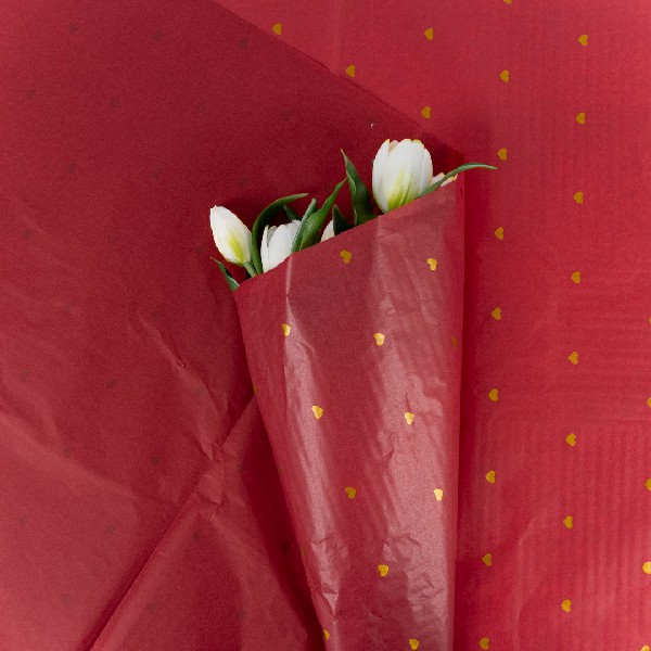 Бумага тишью "Сердечки" 50*70см Бордовый с золотыми серцами (20л)